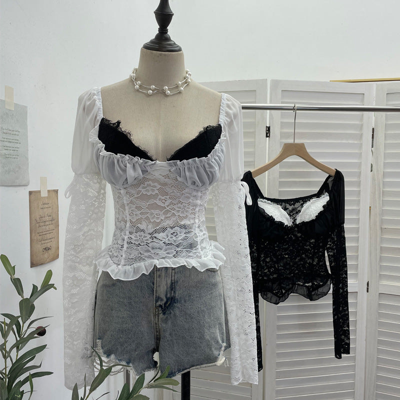 Real Shooting Merard Wind Strapted Bow Splicing Lace Pure Desire Blouse Folding Body Short Blouse 6015 HZ1208