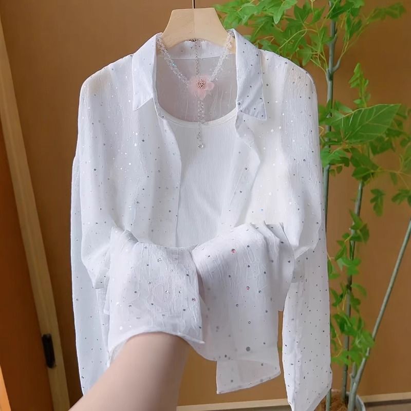Summer New French Fashion Design Slid Sun Protection Blouse POLO Thin Perspective White Shirt Woman HZ1208
