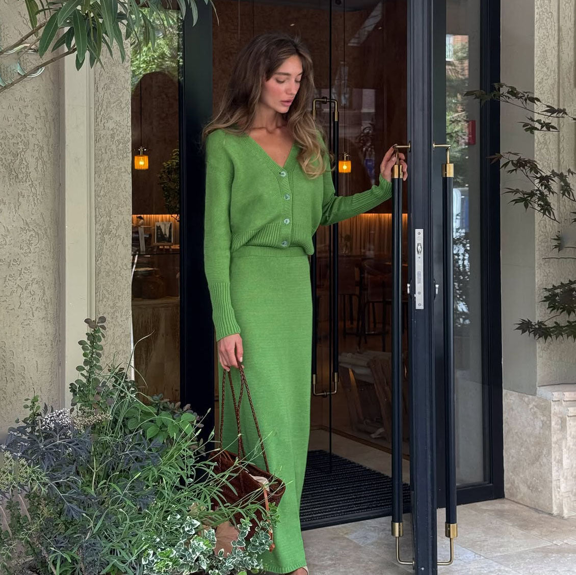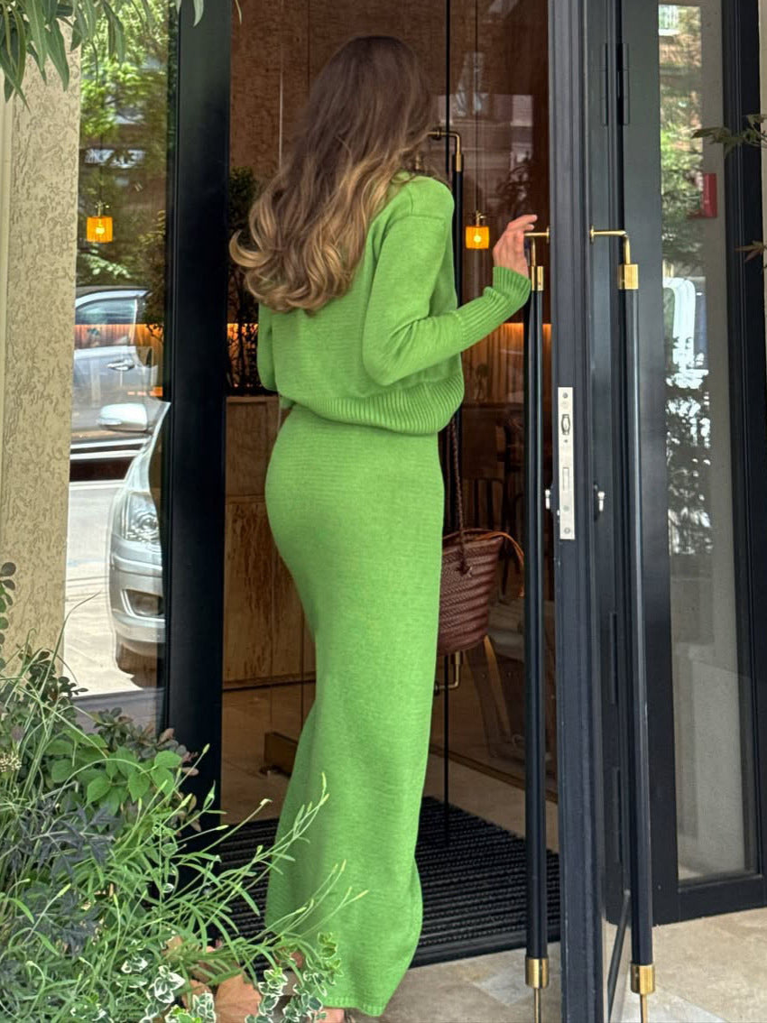New Sen Series V-Neck Cardigan With High-Waisted Long Skirt Knitting Suit Women's Fashion Slim Slim Retro Temperament HZ1208