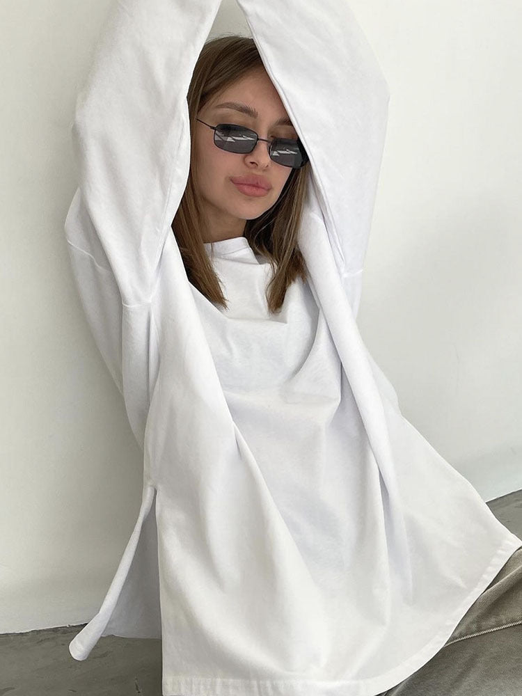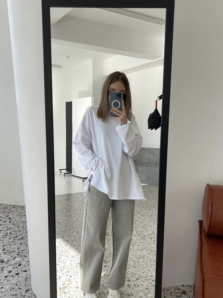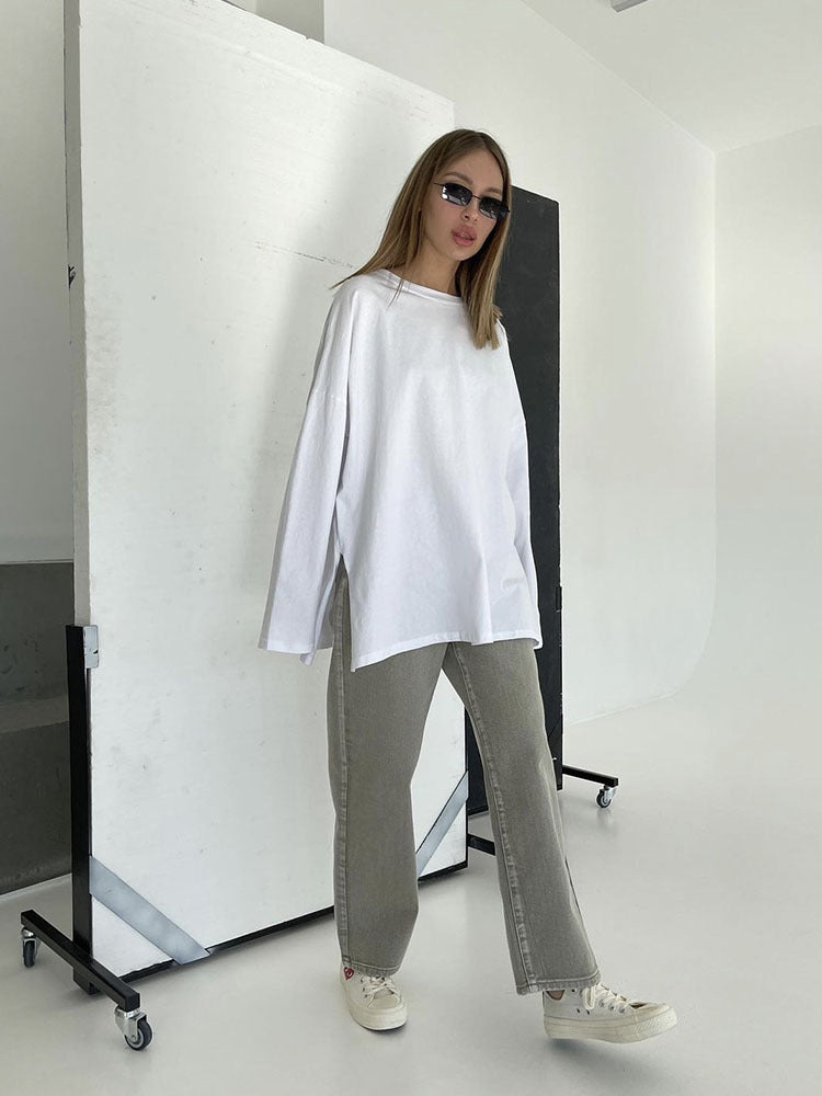 2025 Hot Loose Long-Sleeved Open-Fork T-Shirt Women's Solid Color 100% Cotton Top Spring And Summer Women's Clothing HZ1208