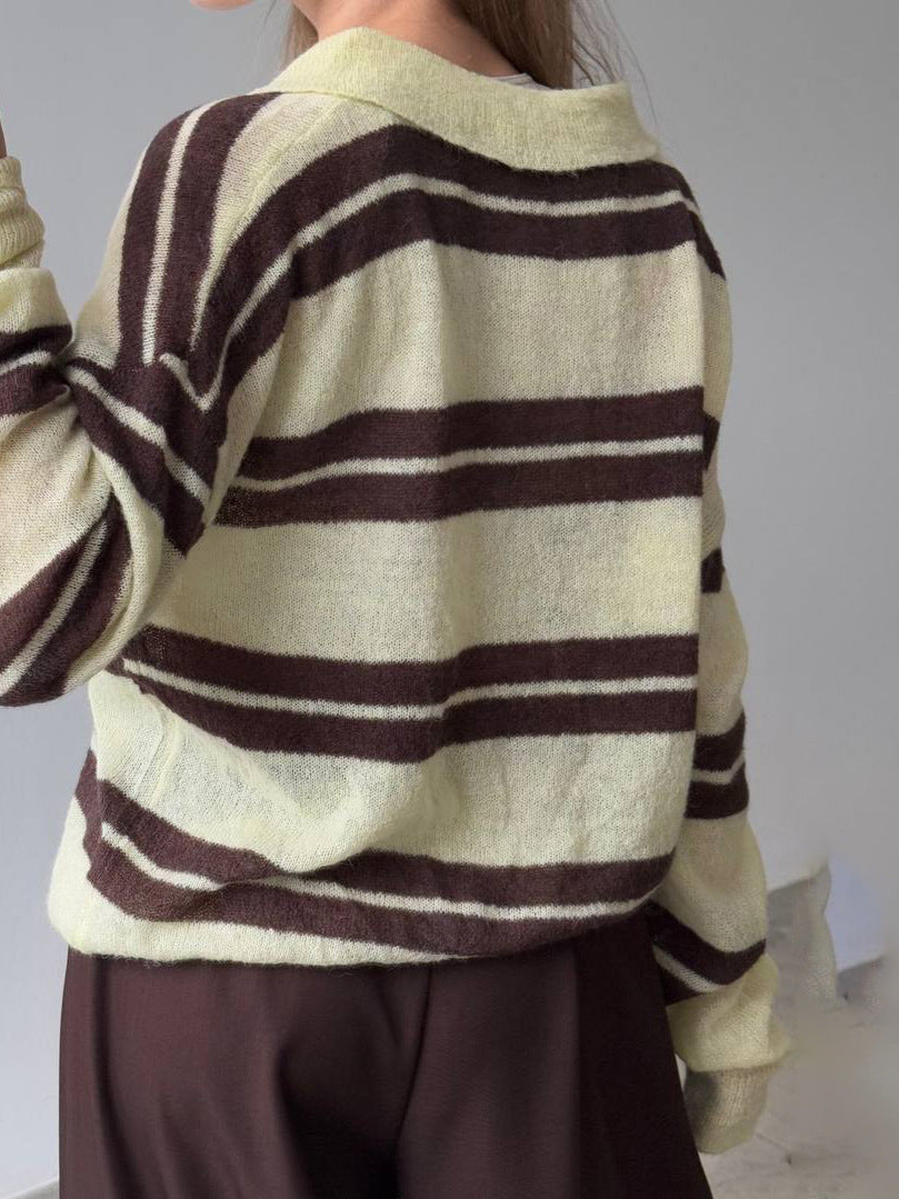 Fashion Striped Knitted POLO Shirt Collar Collar Sweater Loose Leisure Lazy Style New Women's Style HZ1208