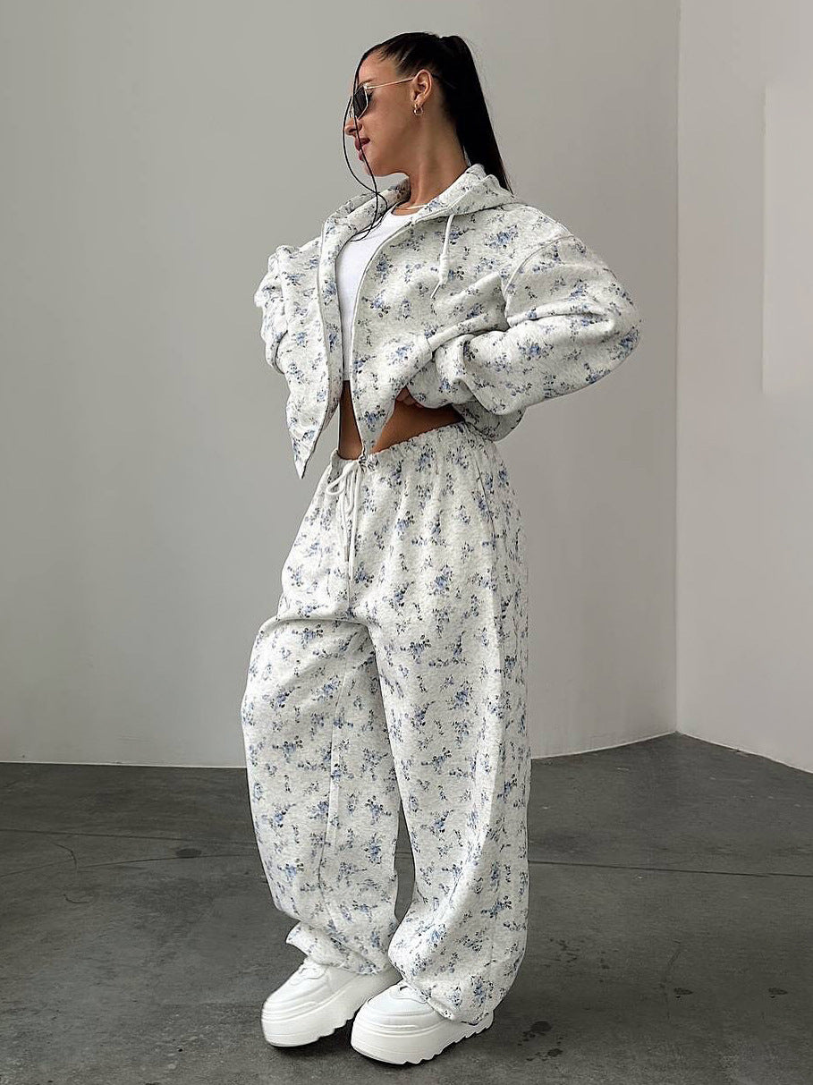 Hot Sale Of Broken Flower Hoodie Set Of Women's Short Zipper Coat Draw Rope Wide Leg Pants Fresh Print Autumn And Winter HZ1208